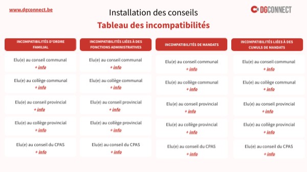 Cette incompatibilité s’applique aussi aux membres du secrétariat du parquet et aux attachés au service de la documentation et de la concordance des textes auprès de la Cour de cassation. Par dérogation, les fonctions de membre du personnel des greffes, des secrétariats de parquet et des services d'appui (tel que défini à l'article 177, § 2, du Code judiciaire) ne sont pas incompatibles avec l'exercice d'un mandat public conféré par élection. Toutefois, les membres du personnel qui souhaitent exercer effectivement pareil mandat ne peuvent pas, pendant la durée de celui-ci, exercer leur fonction au greffe, au secrétariat de parquet ou au service d'appui (article 353ter Code Judiciaire).Ex : Sylvie et Laurent sont mariés. Sylvie a une sœur, Marie, qui elle, est mariée à Christian. Sylvie et Marie étant sœur, elles sont unies par un lien de parenté. Sylvie sera l’alliée au deuxième degré de Christian (son beau-frère), de la même façon que Marie sera l’alliée au deuxième degré de Laurent (son beau-frère). Par contre, Christian n'est pas l'allié de Laurent, il n’est pas son beau-frère (même si on emploie généralement ce terme dans le langage courant). Liens de parenté/alliance · Je ne peux pas être père, mère, fils ou fille (adopté ou adoptant plénièrement) d’un Directeur général, d’un directeur général adjoint ou d’un directeur financier (parenté 1er degré) ; Ex 1 : Si je suis élu(e) échevin(e), ma mère ou mon père ne peut pas être le Directeur général de la commune, ni le directeur général adjoint, ni le directeur financier. Ex 2 : Si je suis élu(e) échevin(e), ma fille ou mon fils ne peut pas être le Directeur général de la commune, ni le directeur général adjoint, ni le directeur financier. · Je ne peux pas être grand-père / grand-mère, petit-fils / petite-fille, frère / sœur d’un Directeur général, d’un directeur général adjoint ou d’un directeur financier (parenté 2ème degré) ; Ex 1 : Si je suis élu(e) échevin(e), ma grand-mère ou mon grand-père ne peut pas être le Directeur général de la commune, ni le directeur général adjoint, ni le directeur financier. Ex 2 : Si je suis élu(e) échevin(e), ma petite-fille ou mon petit-fils ne peut pas être le Directeur général de la commune, ni le directeur général adjoint, ni le directeur financier. Ex 3 : Si je suis élu(e) échevin(e), ma sœur ou mon frère ne peut pas être le Directeur général de la commune, ni le directeur général adjoint, ni le directeur financier. · Je ne peux pas être beau-père/belle-mère, belle-fille/beau-fils d’un Directeur général, d’un directeur général adjoint ou d’un directeur financier (alliés 1er degré) ; Ex 1 : Si je suis élu(e) échevin(e), la mère de de mon époux ne peut pas être le Directeur général de la commune, ni le directeur général adjoint, ni le directeur financier. Ex 2 : Si je suis élu(e) échevin(e), l’épouse de mon fils ne peut pas être le Directeur général de la commune, ni le directeur général adjoint, ni le directeur financier. · Je ne peux pas être le grand-père/la grand-mère de l’époux ou l’épouse d’un Directeur général, d’un directeur général adjoint ou d’un directeur financier (alliés 2ème degré en ligne directe) ; Ex 1 : Si je suis élu(e) échevin(e), le grand-père de mon époux ne peut pas être le Directeur général de la commune, ni le directeur général adjoint, ni le directeur financier. · Je ne peux pas être l’épouse ou l’époux de celle ou celui dont le grand-père/la grand-mère est Directeur général, d’un directeur général adjoint ou d’un directeur financier (alliés 2ème degré en ligne directe) ; Ex 1 : Si je suis élu(e) échevin(e), je ne peux pas être mariée à quelqu’un dont le grand-père est Directeur général, d’un directeur général adjoint ou d’un directeur financier. · Je ne peux pas être beau-frère/belle-sœur d’un Directeur général, d’un directeur général adjoint ou d’un directeur financier (alliés 2ème degré en ligne collatérale). Ex 1 : Si je suis élu(e) échevin(e), le frère de mon épouse ne peut pas être le Directeur général de la commune, ni le directeur général adjoint, ni le directeur financier. Ex 2 : Si je suis élu(e) échevin(e), la sœur de mon époux ne peut pas être la Directrice générale de la commune, ni la directrice générale adjointe, ni la directrice financière. Lien par le mariage · Je ne peux pas être l’épouse ou l’époux d’un Directeur général, d’un directeur général adjoint ou d’un directeur financier. Lien par la cohabitation légale NB : Deux personnes qui vivent ensemble et font une déclaration de cohabitation légale à l'administration communale de leur commune de résidence, sont des cohabitants légaux. Certaines conditions sont à respecter : vous avez la capacité juridique de contracter, vous n'êtes pas mariés, et vous ne cohabitez pas légalement avec une autre personne. Plus d’informations sur https://www.belgium.be/fr/famille/couple/cohabitation/cohabitation_legale · Je ne peux pas avoir fait une déclaration de cohabitation légale avec le Directeur général, le directeur général adjoint ou le directeur financier. /!\ L’alliance étant créée suite au mariage, elle ne s’applique donc pas aux cohabitants légaux. Ex : Sylvie et Laurent sont cohabitants légaux. Laurent est directeur financier. La sœur de Sylvie, Marie, est élue échevine. Elle peut parfaitement l’être, considérant qu’elle n’est pas l’alliée de Laurent, ce dernier étant en cohabitation légale avec Sylvie, et non uni par les liens du mariage. Enfin, aucun de mes parents ou alliés jusqu’au deuxième degré, ni mon/ma conjoint(e), ni la personne avec qui je cohabite légalement ne peux être membres d’un secrétariat d’un membre du Collège (article L1123-31, alinéa 2).