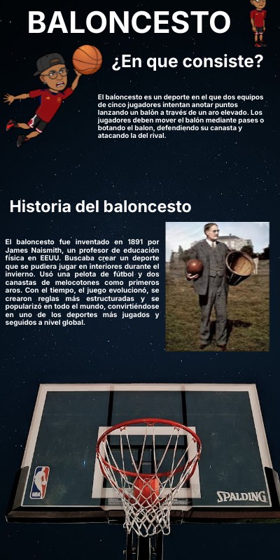 El baloncesto es un deporte en el que dos equipos de cinco jugadores intentan anotar puntos lanzando un balón a través de un aro elevado. Los jugadores deben mover el balón mediante pases o botando el balon, defendiendo su canasta y atacando la del rival.