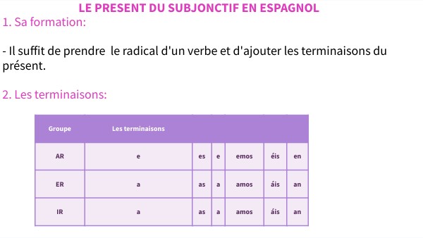 LE PRESENT DU SUBJONCTIF EN ESPAGNOL1. Sa formation:- Il suffit de prendre le radical d'un verbe et d'ajouter les terminaisons du présent. 2. Les terminaisons: