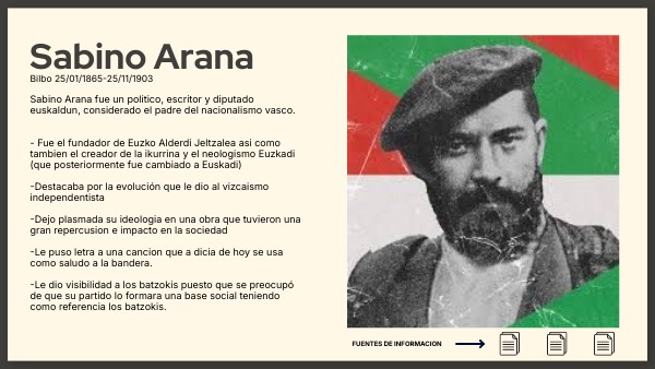 Sabino Arana fue un politico, escritor y diputado euskaldun, considerado el padre del nacionalismo vasco. - Fue el fundador de Euzko Alderdi Jeltzalea asi como tambien el creador de la ikurrina y el neologismo Euzkadi (que posteriormente fue cambiado a Euskadi) -Destacaba por la evolución que le dio al vizcaismo independentista -Dejo plasmada su ideologia en una obra que tuvieron una gran repercusion e impacto en la sociedad -Le puso letra a una cancion que a dicia de hoy se usa como saludo a la bandera. -Le dio visibilidad a los batzokis puesto que se preocupó de que su partido lo formara una base social teniendo como referencia los batzokis.