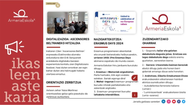 1.- Gogoratu tailer eta geletan debekatuta dagoela jatea. Erretzea ere legez debekatuta dago eskola eremu guztietan, sarreretan barne. 2.- Sarrera-irteeretako baimen bereziak ebatzi ditugu jada eta honen berri gidariak emango dizue aste honetan. 3. Andretxea, Eibarko Emakumeen Etxea erakundearekin elkarlanean hainbat ekintza aurreikusten ditugu:- Autodefentsa feminista tailerra (urrian) -'Luminiszenteak' erakusketaren bisita (urria-azaroa)