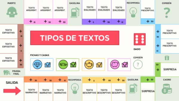 Cada jugador/a debe elegir un color: azul, verde, amarillo o rosa. Así obtiene una ficha para marcar su posición y 10 casas para indicar las propiedades que adquiere a lo largo del juego. Cada jugador debe coger la ficha de su color y colocarla en la casilla de salida. Para empezar a jugar, pincha sobre el dado y mueve tu ficha hasta la casilla que corresponda. En cada casilla debe haber una o varias preguntas. Si la aciertas, coloca una de tus casas en dicha casilla. ¡Enhorabuena, has conseguido una nueva propiedad! Casillas especiales: las casillas con iconos pueden contener sanciones como por ejemplo "El jugador paga impuestos de la luz: pierde 2 casas". ¡Acierta la pregunta para evitar la sanción! Ganará aquel jugador/a que tenga el mayor número de casas sobre el tablero una vez que todas las casillas estén ocupadas.