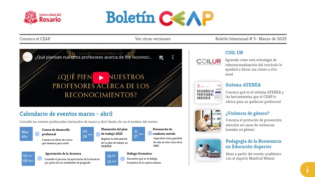 El desarrollo profesoral en la Universidad del Rosario es un programa que busca fortalecer las competencias propias del ejercicio docente, alineándose con el modelo pedagógico institucional del "Aprender a Aprender". En dicho programa, el CEAP ofrece cinco estrategias transversalizadas con 8 líneas de acción.Hemos preparado una infografía donde podrá consultar las principales estrategias, líneas de acción y oportunidades de formación diseñadas para acompañar y potenciar el crecimiento docente en la universidad. Oprima el botón para visualizarla. ¡Explórela y descubra cómo puede fortalecer su práctica académica!