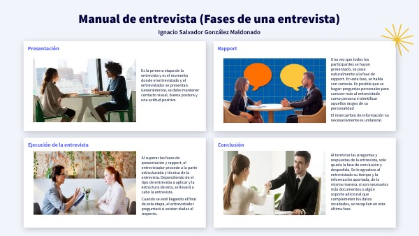 Al superar las fases de presentación y rapport, el entrevistador procede a la parte estructurada y técnica de la entrevista. Dependiendo de el tipo de entrevista a aplicar y la estructura de esta, se llevará a cabo la entrevista. Cuando se esté llegando el final de esta etapa, el entrevistador preguntará si existen dudas al respecto.