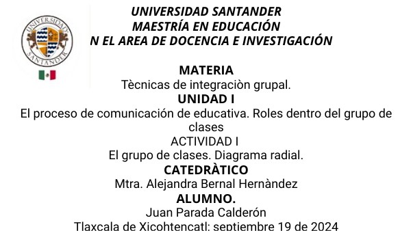 UNIVERSIDAD SANTANDER MAESTRÍA EN EDUCACIÓN EN EL AREA DE DOCENCIA E INVESTIGACIÓN MATERIA Tècnicas de integraciòn grupal. UNIDAD I El proceso de comunicación de educativa. Roles dentro del grupo de clases ACTIVIDAD I El grupo de clases. Diagrama radial. CATEDRÀTICO Mtra. Alejandra Bernal Hernàndez ALUMNO. Juan Parada Calderón Tlaxcala de Xicohtencatl; septiembre 19 de 2024