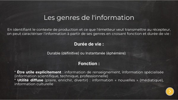 En identifiant le contexte de production et ce que l'émetteur veut transmettre au récepteur, on peut caractériser l'information à partir de ses genres en croisant fonction et durée de vie :