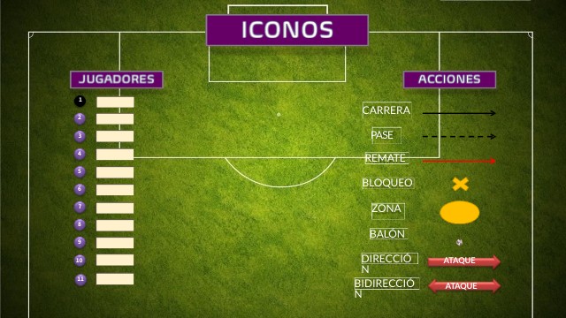 Jugador 8 inicia con pase a jugador 6, este controla mientras que jugador 8 hace movimiento de ir y volver, jugador 6 se la devuelve y 8 juega de cara con 10 que mete balón a la carrera de jugador 2 buscando espaldas de lateral izquierdo. Jugador 7, 11, 9 entran en velocidad al área.