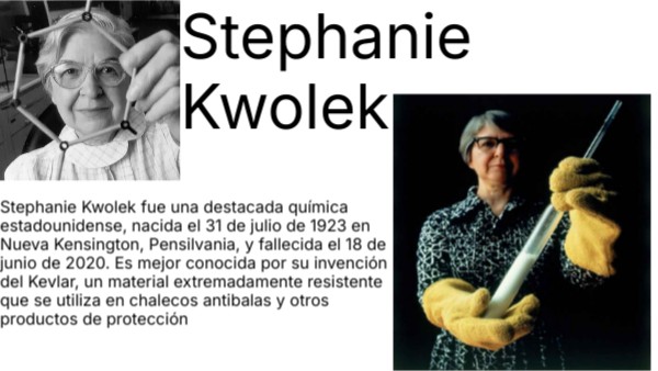 Stephanie Kwolek fue una destacada química estadounidense, nacida el 31 de julio de 1923 en Nueva Kensington, Pensilvania, y fallecida el 18 de junio de 2020. Es mejor conocida por su invención del Kevlar, un material extremadamente resistente que se utiliza en chalecos antibalas y otros productos de protección
