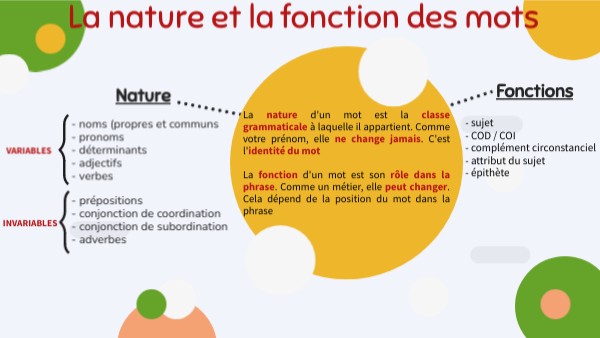La nature d'un mot est la classe grammaticale à laquelle il appartient. Comme votre prénom, elle ne change jamais. C'est l'identité du mot La fonction d'un mot est son rôle dans la phrase. Comme un métier, elle peut changer. Cela dépend de la position du mot dans la phrase