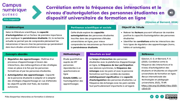 Pour citer ce document : Pôle d’expertise interordres en formation à distance. (2024). Corrélation entre la fréquence des interactions et le niveau d’autorégulation des étudiants et étudiantes en dispositif universitaire de formation en ligne. [Fiche de lecture de Corrélation entre la fréquence des interactions et le niveau d’autorégulation des étudiants et étudiantes en dispositif universitaire de formation en ligne, par E. G. Djiezion et F.-X. Bernard, 2023]. Campus numérique Québec. Sous licence CC BY-NC-SA. https://view.genially.com/66ed7d25d09a4ddb52af8926