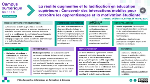 Pour citer ce document : Pôle d’expertise interordres en formation à distance. (2024). La réalité augmentée et la ludification en éducation supérieure : Concevoir des interactions mobiles pour accroître les apprentissages et la motivation étudiante. [Fiche de lecture de Augmented reality and gamification in higher education : Designing mobile interaction to enhance students’ motivation and learning. E-Learning and Digital Media, par Ivarson, E., Erlandsson, V., Faraon, M. et Khatib, S., 2024]. Campus numérique Québec. Licence CC-BY-NC-SA