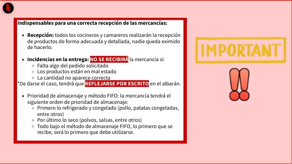 - Recepción: todos los cocineros y camareros realizarán la recepción de productos de forma adecuada y detallada, nadie queda eximido de hacerlo.