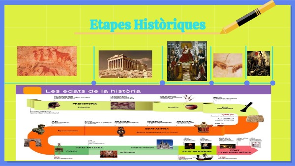 Prehistòria La Prehistòria és l'etapa més llarga de la història i comença amb l'aparició dels primers éssers humans, fa 2.500.000 anys, i finalitza amb l'escriptura, fa uns 5.000 anys. Es divideix amb 3 grans etapes: l' edat de pedra, l'edat de bronze i l'edat de ferro. També en aquesta etapa es va descobrir el foc.