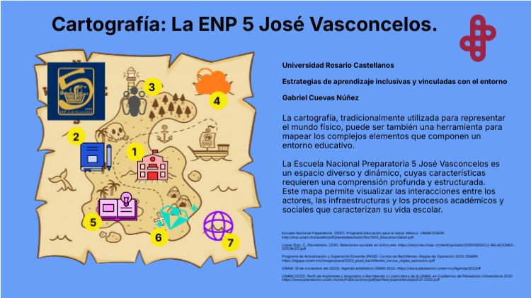 La cartografía, tradicionalmente utilizada para representar el mundo físico, puede ser también una herramienta para mapear los complejos elementos que componen un entorno educativo. La Escuela Nacional Preparatoria 5 José Vasconcelos es un espacio diverso y dinámico, cuyas características requieren una comprensión profunda y estructurada. Este mapa permite visualizar las interacciones entre los actores, las infraestructuras y los procesos académicos y sociales que caracterizan su vida escolar.
