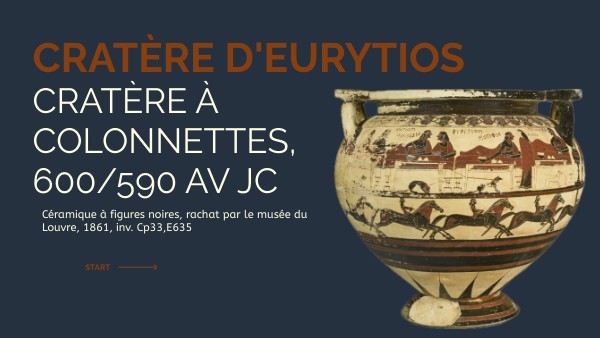 Ouvrages :• J. Charbonneau , R.Martin, F.Villard, Grèce archaïque (620-480 av.J-C.), collection L’univers des formes, Barcelone, Gallimard ed., 2008 • A.Coulié, La céramique grecque aux époques géométrique et orientalisante (XIe-VIe siècle av. J.-C.), Paris, Picard éd., 2013 • M.Denoyelle, Chefs-d'oeuvre de la céramique grecque au Musée du Louvre, Paris, RMN, 1994 • B. Holtzmann, B., A. Pasquier, Histoire de l'art antique. L'art grec, Manuels de l'Ecole du Louvre, Paris, RMN, 1998. Ouvrage en ligne : • Pottier, Edmond, Vases antiques du Louvre. salles A-E, les origines, les styles primitifs, écoles rhodienne et corinthienne, [en ligne], Paris, Hachette, 1897, consulté le 17/09/2024, disponible sur http://gallica.bnf.fr/ark:/12148/bpt6k62325441/f17.item.zoom , Article en ligne : • Pasquier, Alain, « Un cratère-rafraîchissoir au musée du Louvre : du vin frais pour un banquet de luxe », Monuments et mémoires publiés par l’Académie des Inscriptions et Belles-Lettres, [en ligne], Fondation Eugène Piot, 78, 2000, consulté le 17/09/2024, disponible sur : http://www.persee.fr/collection/piot Site internet : • Musée du Louvre, s.d., « Cratère d’Eurytios », in Louvre site des collections : vases et vaisselle, [en ligne], https://collections.louvre.fr/ark:/53355/cl010268234, consulté le 17/09/2024.