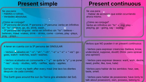 Se usa para: - Hábitos o rutinas. - Verdades absolutas. ¿Cómo se conjuga? - 3ª persona del plural, 1ª persona o 2ª persona: verbo en infinitivo sin ''to'': believe, go, do, drink, wash... - 3ª persona del singular: verbo en infinitivo sin ''to'': believe - believes, make -makes, drink - drinks, come - comes, play -plays, pray - prays...