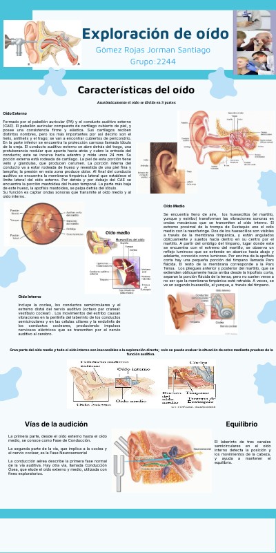 Oído Externo Formado por el pabellón auricular (PA) y el conducto auditivo externo (CAE). El pabellón auricular compuesto de cartílago cubierto de piel, y posee una consistencia firme y elástica. Sus cartílagos reciben distintos nombres, pero los más importantes por así decirlo son el helix, antihelix y el trago; se van a encontrar cubiertos de pericondrio. En la parte inferior se encuentra la protección carnosa llamada lóbulo de la oreja. El conducto auditivo externo se abre detrás del trago, una protuberancia nodular que apunta hacia atrás y cubre la entrada del conducto; este se incurva hacia adentro y mide unos 24 mm. Su poción externa está rodeada de cartílago. La piel de esta porción tiene vello y glandulas, que producen cerumen. La porción interna del conducto va a estar rodeada de hueso y revestida de una piel fina y lampiña; la presión en esta zona produce dolor. Al final del conducto auditivo se encuentra la membrana timpánica lateral que establece el límite lateral del oído externo. Por detrás y por debajo del CAE se encuentra la porción mastoidea del hueso temporal. La parte más baja de este hueso, la apofisis mastoides, se palpa detrás del lóbulo. Su función es captar ondas sonoras que transmite al oído medio y al oído interno.
