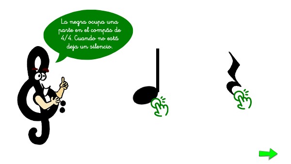 La negra ocupa una parte en el compás de 4/4. Cuando no está deja un silencio.
