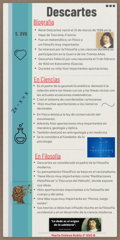 - Tiene libros muy importantes como "Meditaciones Metafísicas" o "Discurso del Método", donde expone sus ideas.