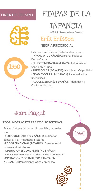 Esta teoría se divide en 8 edades, de nombre:- INFANCIA (1-2 AÑOS): Confianza básica vs Desconfianza. - NIÑEZ TEMPRANA (2-4 AÑOS): Autonomía vs Verguenza / Duda. - PREESCOLAR (4-5 AÑOS): Iniciativa vs Culpabilidad. - EDAD ESCOLAR (5-12 AÑOS ): Laboriosidad vs Inferioridad . - ADOLESCENCIA (13-19 AÑOS): Identidad vs Confusión de roles.