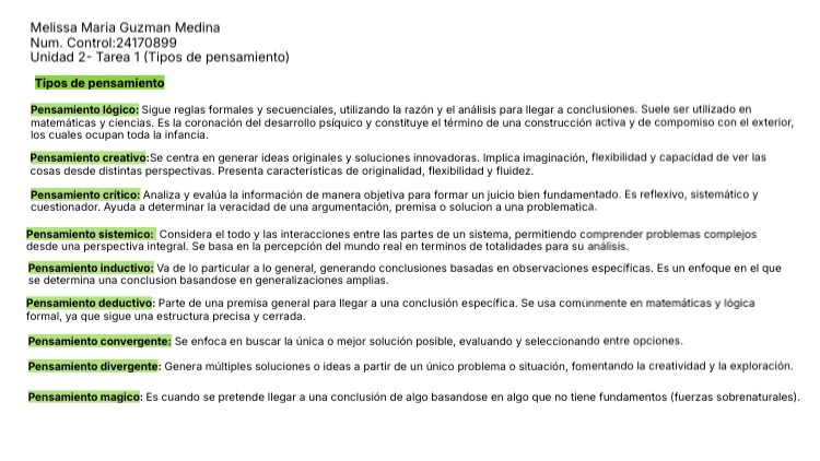 Melissa Maria Guzman Medina Num. Control:24170899 Unidad 2- Tarea 1 (Tipos de pensamiento)