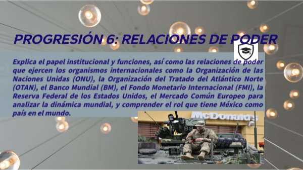 Explica el papel institucional y funciones, así como las relaciones de poder que ejercen los organismos internacionales como la Organización de las Naciones Unidas (ONU), la Organización del Tratado del Atlántico Norte (OTAN), el Banco Mundial (BM), el Fondo Monetario Internacional (FMI), la Reserva Federal de los Estados Unidos, el Mercado Común Europeo para analizar la dinámica mundial, y comprender el rol que tiene México como país en el mundo.