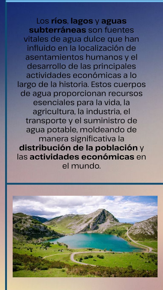 Los ríos, lagos y aguas subterráneas son fuentes vitales de agua dulce que han influido en la localización de asentamientos humanos y el desarrollo de las principales actividades económicas a lo largo de la historia. Estos cuerpos de agua proporcionan recursos esenciales para la vida, la agricultura, la industria, el transporte y el suministro de agua potable, moldeando de manera significativa la distribución de la población y las actividades económicas en el mundo.