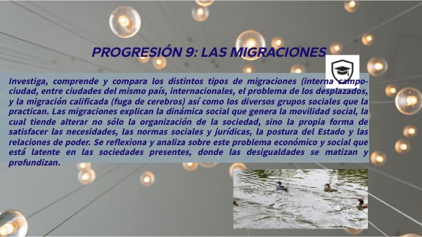 Investiga, comprende y compara los distintos tipos de migraciones (interna campo-ciudad, entre ciudades del mismo país, internacionales, el problema de los desplazados, y la migración calificada (fuga de cerebros) así como los diversos grupos sociales que la practican. Las migraciones explican la dinámica social que genera la movilidad social, la cual tiende alterar no sólo la organización de la sociedad, sino la propia forma de satisfacer las necesidades, las normas sociales y jurídicas, la postura del Estado y las relaciones de poder. Se reflexiona y analiza sobre este problema económico y social que está latente en las sociedades presentes, donde las desigualdades se matizan y profundizan.