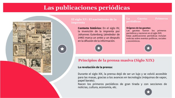 La revolución de la prensa:Durante el siglo XIX, la prensa dejó de ser un lujo y se volvió accesible para las masas, gracias a los avances en tecnología (máquinas de vapor, papel barato). Nacen los primeros periódicos de gran tirada y con secciones de noticias, cultura, economía, etc.