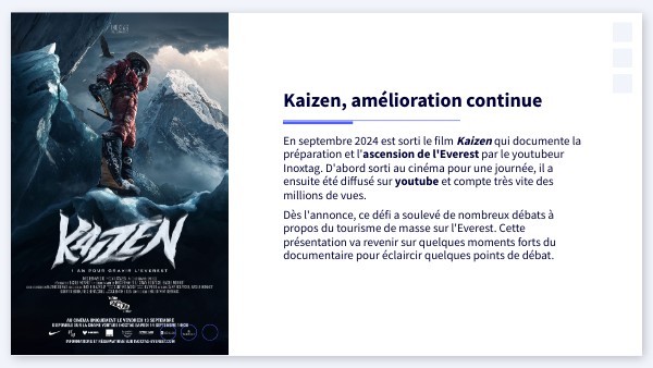 En septembre 2024 est sorti le film Kaizen qui documente la préparation et l'ascension de l'Everest par le youtubeur Inoxtag. D'abord sorti au cinéma pour une journée, il a ensuite été diffusé sur youtube et compte très vite des millions de vues. Dès l'annonce, ce défi a soulevé de nombreux débats à propos du tourisme de masse sur l'Everest. Cette présentation va revenir sur quelques moments forts du documentaire pour éclaircir quelques points de débat.