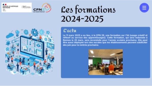 Le 11 mars 2025 a eu lieu, à la CPN 29, une formation sur l'IA (usage créatif et réflexif au service des apprentissages). Cette formation, qui sera redonnée à Rennes le 25 mars, sera reconduite pour l'année scolaire prochaine. Elle peut être aussi déployée lors des escales que les établissements peuvent sdolliciter dès juin pour la rentrée prochaine.