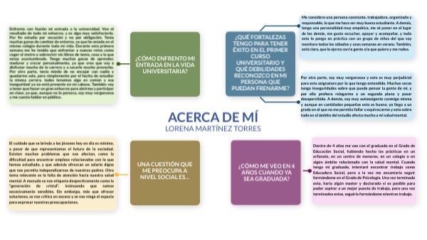 Me considero una persona constante, trabajadora, organizada y responsable, lo que me hace ser muy buena estudiante. A demás, tengo una personalidad muy empática, me sé poner en el lugar de los demás, me gusta escuchar, apoyar y acompañar, y todo esto lo pongo en práctica con un grupo de niños del que soy monitora todos los sábados y unas semanas en verano. También, está claro, que lo ejerzo con la gente a la que quiero y me rodea.