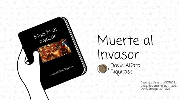 [Mural “Muerte al invasor”; Escuela México] [fotografía] Jack Ceitelis. (s/f). BND: Territorial: Comunal. Recuperado el 23 de septiembre de 2024, de https://www.bibliotecanacionaldigital.gob.cl/bnd/635/w3-article-644958.html Neocrotalic.com. (2023, August 2). David Alfaro Siqueiros - El muralista revolucionario del movimiento artístico mexicano. NeoCrotalic Art. https://www.neocrotalic.com/post/david-alfaro-siqueiros-el-muralista-revolucionario-del-movimiento-artistico-mexicano?lang=es [Mural “Muerte al invasor”; Escuela México] [fotografía] Jack Ceitelis. (s/f). BND: Territorial: Comunal. Recuperado el 23 de septiembre de 2024, de https://www.bibliotecanacionaldigital.gob.cl/bnd/635/w3-article-644958.html David Alfaro Siqueiros. (1896). HA! https://historia-arte.com/artistas/david-alfaro-siqueiros#:~:text=David%20Alfaro%20Siqueiros%20fue%20uno,vez%20muy%20colorido%20y%20din%C3%A1mico. Equipo Editorial. (2024, 25 junio). David Alfaro Siqueiros: obras y biografía del muralista mexicano. Cultura Genial. https://www.culturagenial.com/es/david-alfaro-siqueiros/