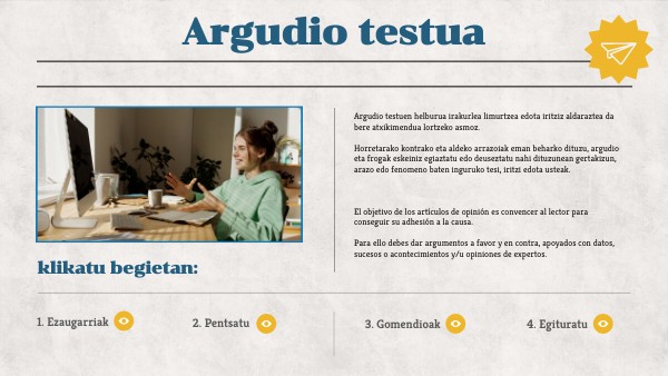 Argudio testuen helburua irakurlea limurtzea edota iritziz aldaraztea da bere atxikimendua lortzeko asmoz. Horretarako kontrako eta aldeko arrazoiak eman beharko dituzu, argudio eta frogak eskeiniz egiaztatu edo deuseztatu nahi dituzunean gertakizun, arazo edo fenomeno baten inguruko tesi, iritzi edota usteak. El objetivo de los artículos de opinión es convencer al lector para conseguir su adhesión a la causa. Para ello debes dar argumentos a favor y en contra, apoyados con datos, sucesos o acontecimientos y/u opiniones de expertos.