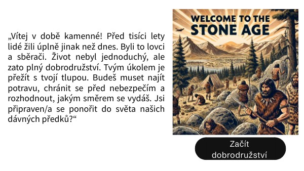 „Vítej v době kamenné! Před tisíci lety lidé žili úplně jinak než dnes. Byli to lovci a sběrači. Život nebyl jednoduchý, ale zato plný dobrodružství. Tvým úkolem je přežít s tvojí tlupou. Budeš muset najít potravu, chránit se před nebezpečím a rozhodnout, jakým směrem se vydáš. Jsi připraven/a se ponořit do světa našich dávných předků?“