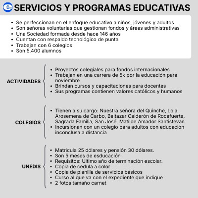 Tienen a su cargo: Nuestra señora del Quinche, Lola Arosemena de Carbo, Baltazar Calderón de Rocafuerte, Sagrada Familia, San José, Matilde Amador Santistevan