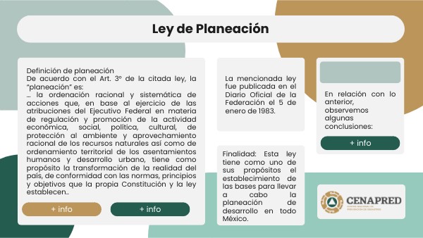 La planeación es fundamental para el desarrollo ordenado y coherente de un país, abarcando aspectos económicos, sociales, culturales, políticos, ambientales y de reducción del riesgo de desastres (aunque no está mencionado en la Ley de Planeación, como hemos visto anteriormente, la GIR es una perspectiva transversal necesaria para el desarrollo sostenible y la protección de todos los sectores). El gobierno, ya sea Federal, Estatal o Municipal, juega un papel central en la planeación, utilizando su capacidad de regulación y promoción para guiar el desarrollo. La meta de la planeación es transformar el país de manera positiva, siguiendo los principios establecidos en la Constitución y otras leyes importantes. La planeación debe ser integral, considerando una amplia gama de factores y buscando el equilibrio entre el desarrollo económico, social, y la sostenibilidad ambiental. La planeación es un proceso complejo y multidimensional que busca guiar el desarrollo del país de manera ordenada, racional, y alineada con los valores y objetivos nacionales establecidos legalmente y es una herramienta clave para el progreso y bienestar de la nación.