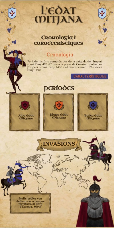 Ruralització: la població abandona les ciutats i es concentra a les zones rurals. Successives onades d'invasions, protagonitzades pels pobles germànics (segle V), musulmans (segle VII) i vikings (segles VIII-XI). Sentiment d'inseguretat de la societat, que genera relacions de dependència > feudalisme. Tres imperis conviuen i lluiten per la supremacia: el bizantí, l'àrab i el carolingi. A la societat, la classe dominant és la noblesa, que està composta per senyors de la guerra i propietaris de grans extensions de cultius (latifundis).