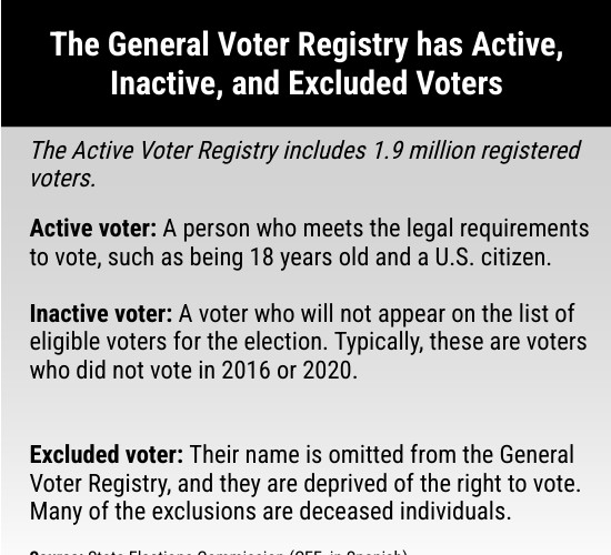 Active voter: A person who meets the legal requirements to vote, such as being 18 years old and a U.S. citizen. Inactive voter: A voter who will not appear on the list of eligible voters for the election. Typically, these are voters who did not vote in 2016 or 2020. Excluded voter: Their name is omitted from the General Voter Registry, and they are deprived of the right to vote. Many of the exclusions are deceased individuals.