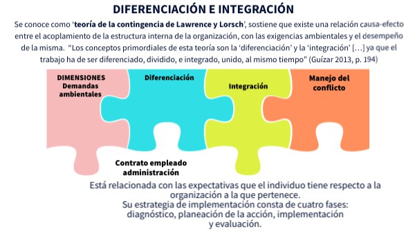 Se conoce como ‘teoría de la contingencia de Lawrence y Lorsch’, sostiene que existe una relación causa-efecto entre el acoplamiento de la estructura interna de la organización, con las exigencias ambientales y el desempeño de la misma. “Los conceptos primordiales de esta teoría son la ‘diferenciación’ y la ‘integración’ […] ya que el trabajo ha de ser diferenciado, dividido, e integrado, unido, al mismo tiempo” (Guízar 2013, p. 194)