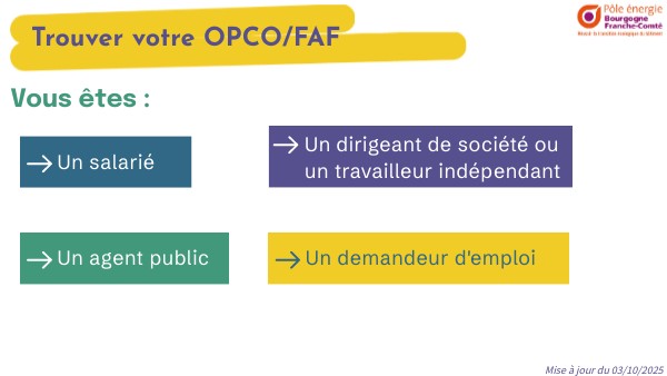 Les fonds de la formation étant collectés par l'URSAFF, les financements de type OPCO ou Fond d'Assurance ne sont pas disponibles pour les agents publics. Pour suivre une formation du Pôle énergie, il convient de vous renseigner auprès de votre hierarchie et/ou votre service RH.