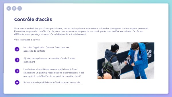 Vous avez distribué des pass à vos participants, soit en les imprimant vous-même, soit en les partageant sur leur espace personnel.En mettant en place le contrôle d'accès, vous pourrez scanner les pass de vos participants pour vérifier leurs droits d'accès aux différents repas, parkings et zones d'accréditation de votre événement. Voici les étapes à suivre :
