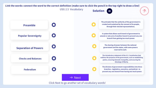 Link the words: connect the word to the correct definition (make sure to click the pencil in the top right to draw a line)
