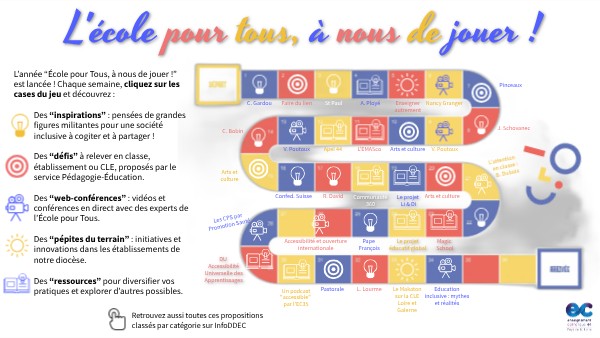 L’année “École pour Tous, à nous de jouer !” est lancée ! Chaque semaine, cliquez sur les cases du jeu et découvrez : Des “inspirations” : pensées de grandes figures militantes pour une société inclusive à cogiter et à partager ! Des “défis” à relever en classe, établissement ou CLE, proposés par le service Pédagogie-Éducation. Des “web-conférences” : vidéos et conférences en direct avec des experts de l’École pour Tous. Des “pépites du terrain” : initiatives et innovations dans les établissements de notre diocèse. Des “ressources” pour diversifier vos pratiques et explorer d’autres possibles.