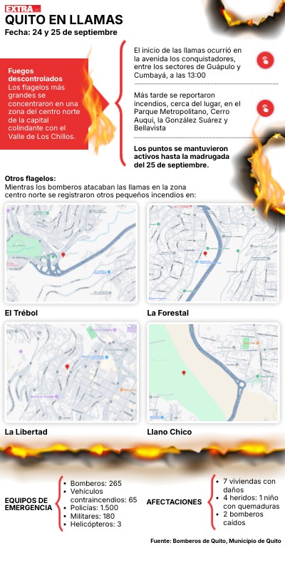 Fuegos descontrolados Los flagelos más grandes se concentraron en una zona del centro norte de la capital colindante con el Valle de Los Chillos.