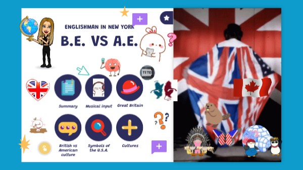 VIDEO: AN ENGLISHMAN IN NEW YORK (Edpuzzle) Brainstorming Geography and Culture of Great Britain Stereotypes - Citizenship: Respect, Diversity, Bullying British English vs American English The Hymns of Great Britain, Italy and the United States Totem Pole Canada Famous Americans