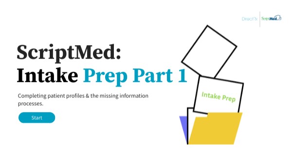ScriptMed operates in stages. Each stage is a piece of the puzzle that moves an order closer to shipping out and helping a patient Get Better!Intake Prep is the third stage in the new patient/therapy workflow. This stage is where the patient profile is completed (conditions, allergies, medications, additional contact information, etc.) and where the missing information process occurs. Intake Prep is also where the benefit investigation is completed, but that will be covered in Intake Prep Part 2 training. This course focuses on completing patient profiles and the steps to the missing information process. Click the arrow at the right to begin!