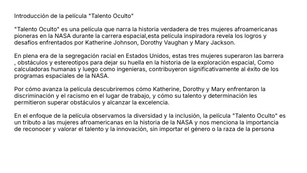 Introducción de la película "Talento Oculto" "Talento Oculto" es una película que narra la historia verdadera de tres mujeres afroamericanas pioneras en la NASA durante la carrera espacial,esta película inspiradora revela los logros y desafíos enfrentados por Katherine Johnson, Dorothy Vaughan y Mary Jackson. En plena era de la segregación racial en Estados Unidos, estas tres mujeres superaron las barrera , obstáculos y estereotipos para dejar su huella en la historia de la exploración espacial, Como calculadoras humanas y luego como ingenieras, contribuyeron significativamente al éxito de los programas espaciales de la NASA. Por cómo avanza la película descubriremos cómo Katherine, Dorothy y Mary enfrentaron la discriminación y el racismo en el lugar de trabajo, y cómo su talento y determinación les permitieron superar obstáculos y alcanzar la excelencia. En el enfoque de la película observamos la diversidad y la inclusión, la película "Talento Oculto" es un tributo a las mujeres afroamericanas en la historia de la NASA y nos menciona la importancia de reconocer y valorar el talento y la innovación, sin importar el género o la raza de la persona
