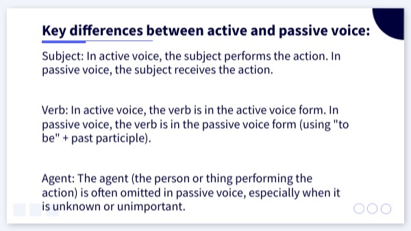 Subject: In active voice, the subject performs the action. In passive voice, the subject receives the action. Verb: In active voice, the verb is in the active voice form. In passive voice, the verb is in the passive voice form (using "to be" + past participle). Agent: The agent (the person or thing performing the action) is often omitted in passive voice, especially when it is unknown or unimportant.