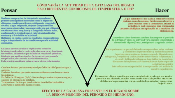 Mediante una practica de laboratorio aprendimos. primero conseguimos materiales como el higado en diferentes condiciones (fresco, refrigerado, congelado, cocido), y agua oxigenada, despues comparamos las reacciones observadas y nos sorprendio por qué el hígado cocido reacciono muy poco y el congelado fue más lento, confirmando la teoría de que el calor desnaturaliza las enzimas y el frío inhibe su actividad. Hablamos en equipo sobre los resultados comprendiendo mejor la importancia de las condiciones para la actividad enzimática.